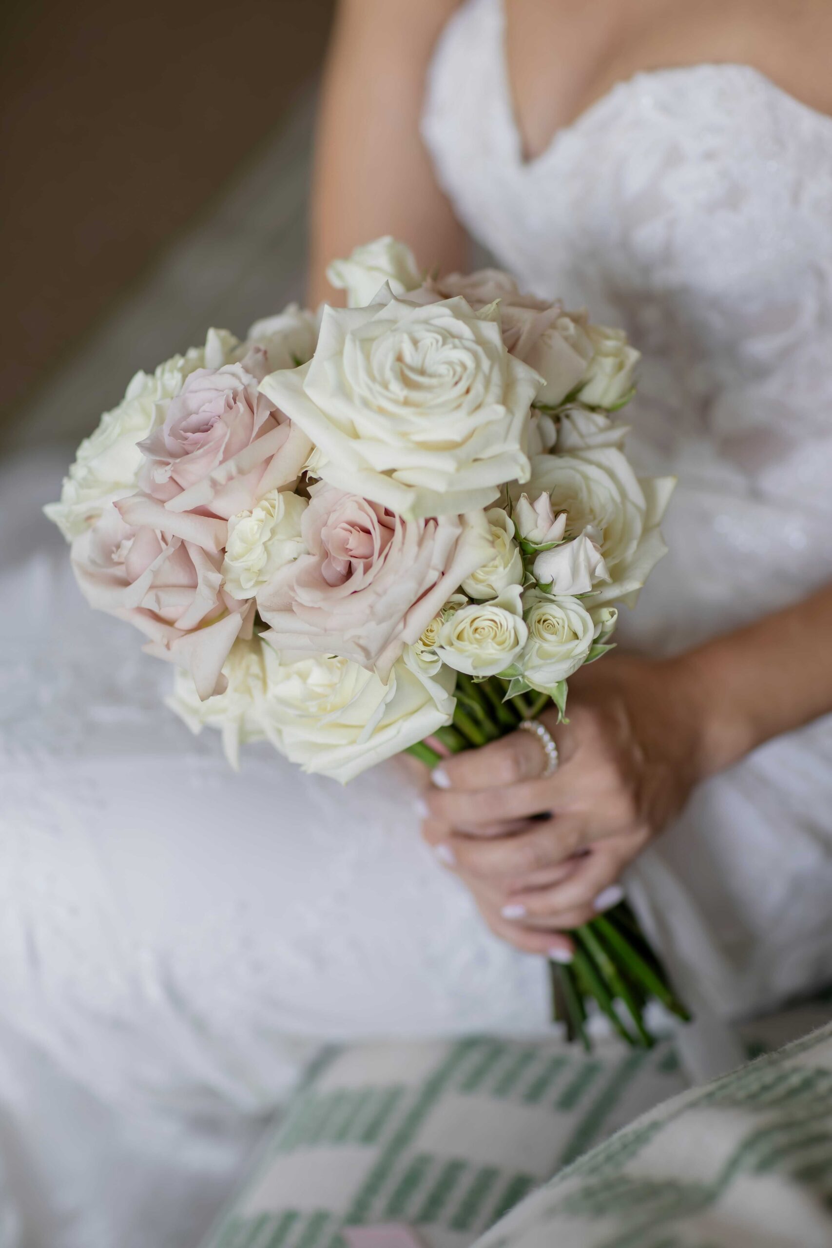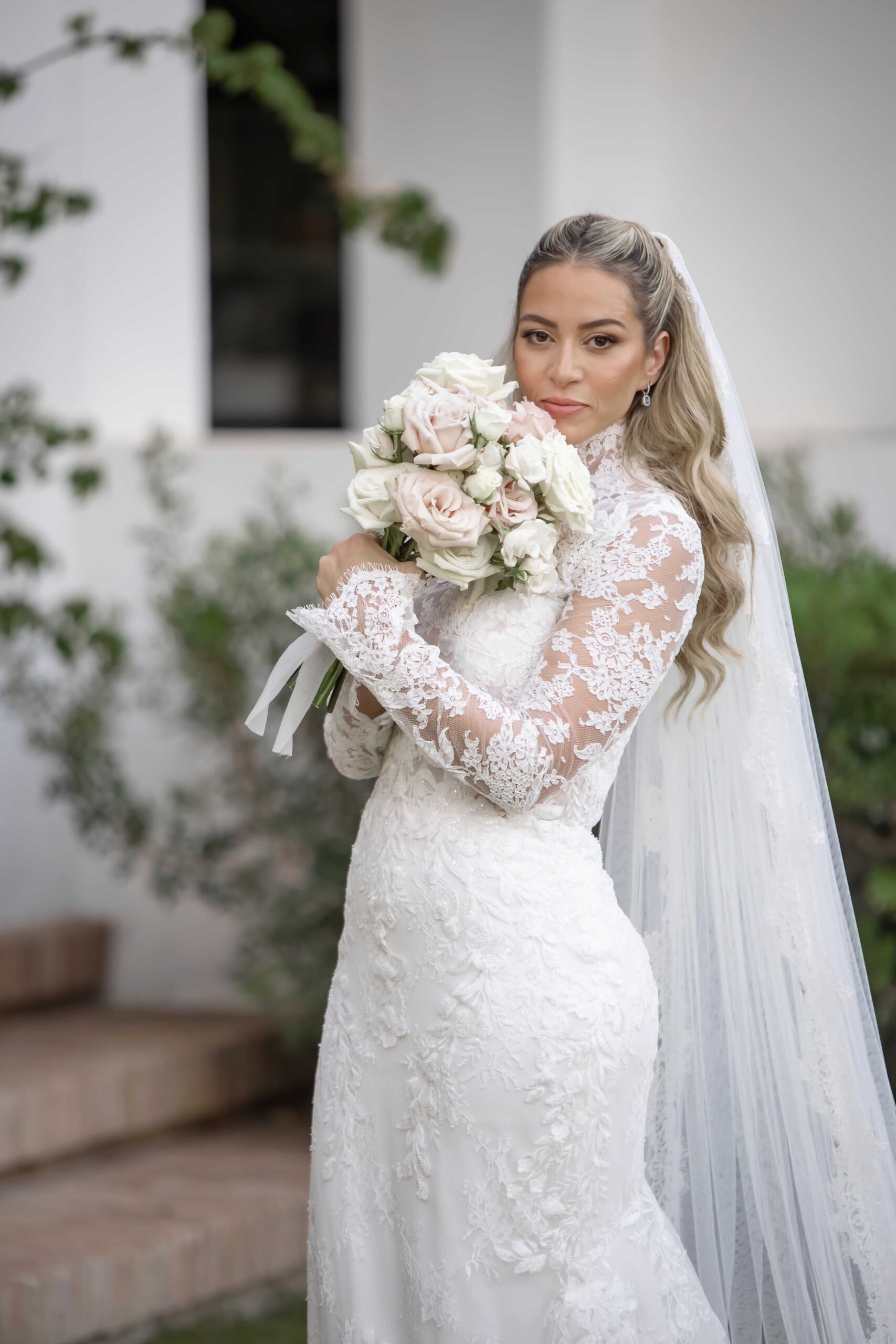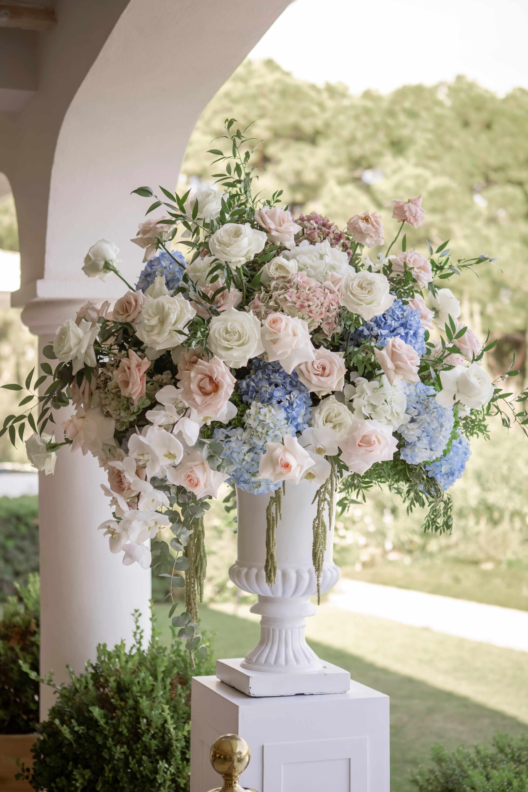 Our palette came together effortlessly: white, green, and light blue, softened with just a touch of blush pink. Surrounded by the feeling of a dreamy Villa Wedding in Marbella, then came the flowers. With so many stunning options, narrowing them down was no small task. After much thought, we chose a combination of varities that felt perfectly “us”: white roses , white lisianthus, Quick Sand roses, blue delphinium, green amaranthus, white delphinium, green hydrangeas, white orchids, and blue hydrangeas. Each bloom added its own texture and colour, creating bouquets and arrangements that were both unique and personal. A true reflection of the day we had envisioned.