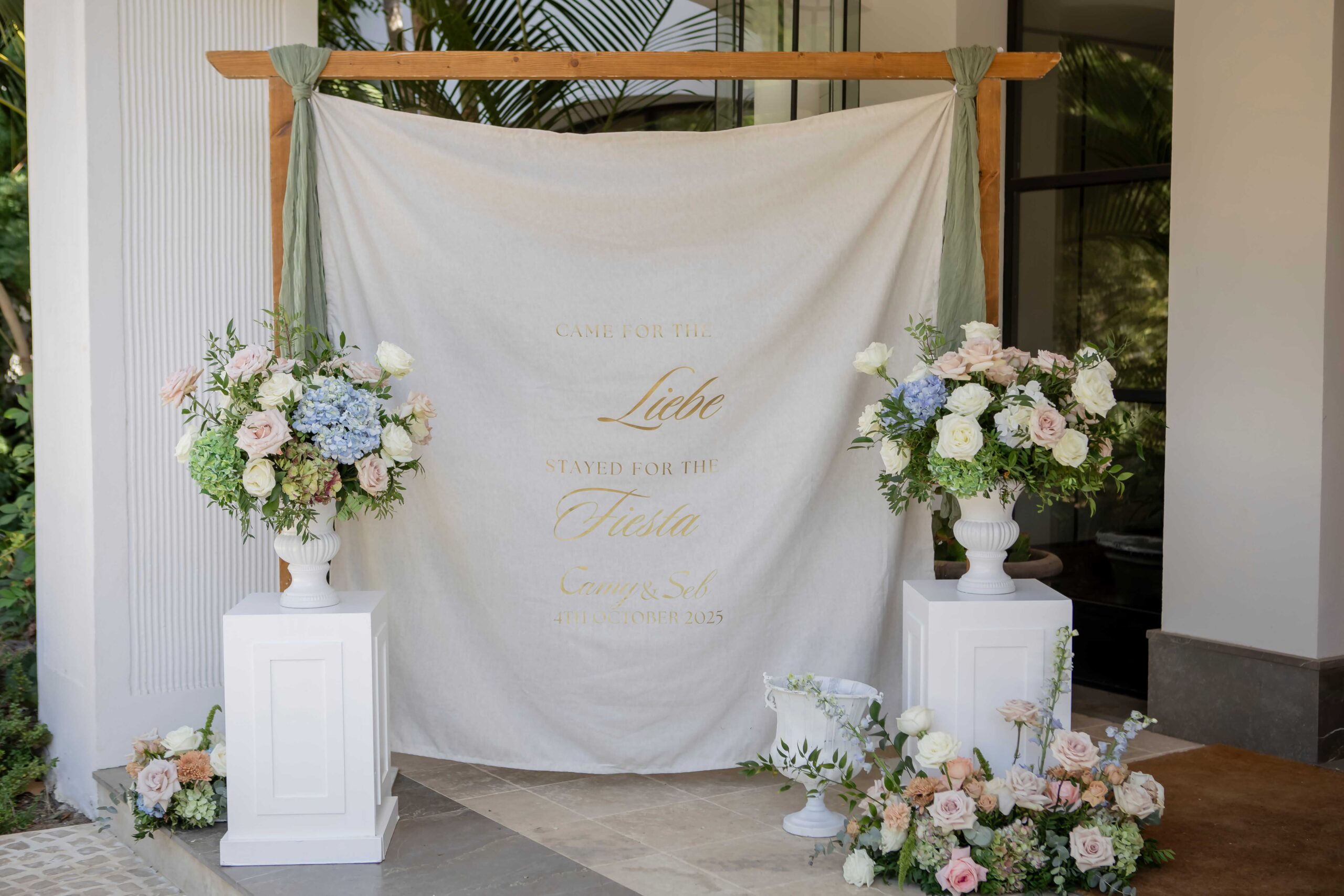 Next, we needed the perfect place to say “I do,” and Villa Gratitude in Marbella was everything we could have dreamed of the essence of a Villa Wedding in Marbella. The spacious terraces, gardens, and sweeping views of the Mediterranean seemed to stretch endlessly, blending effortlessly with the soft light of the afternoon. As guests arrived, the first glimpse of the entrance set the tone: a stunning beige fabric draped elegantly, carrying the playful quote, “Came for the Liebe and stayed for the Fiesta,” a heartfelt touch to our Argentinian and German roots. Beside it stood the familiar white pillar we’ve used in countless weddings, now part of our own story, marking the start of a day that felt both deeply personal and joyfully magical. The villa, the décor, and the people arriving all merged into one seamless, unforgettable moment a perfect beginning to our celebration, wrapped in the spirit of a Villa Wedding in Marbella.