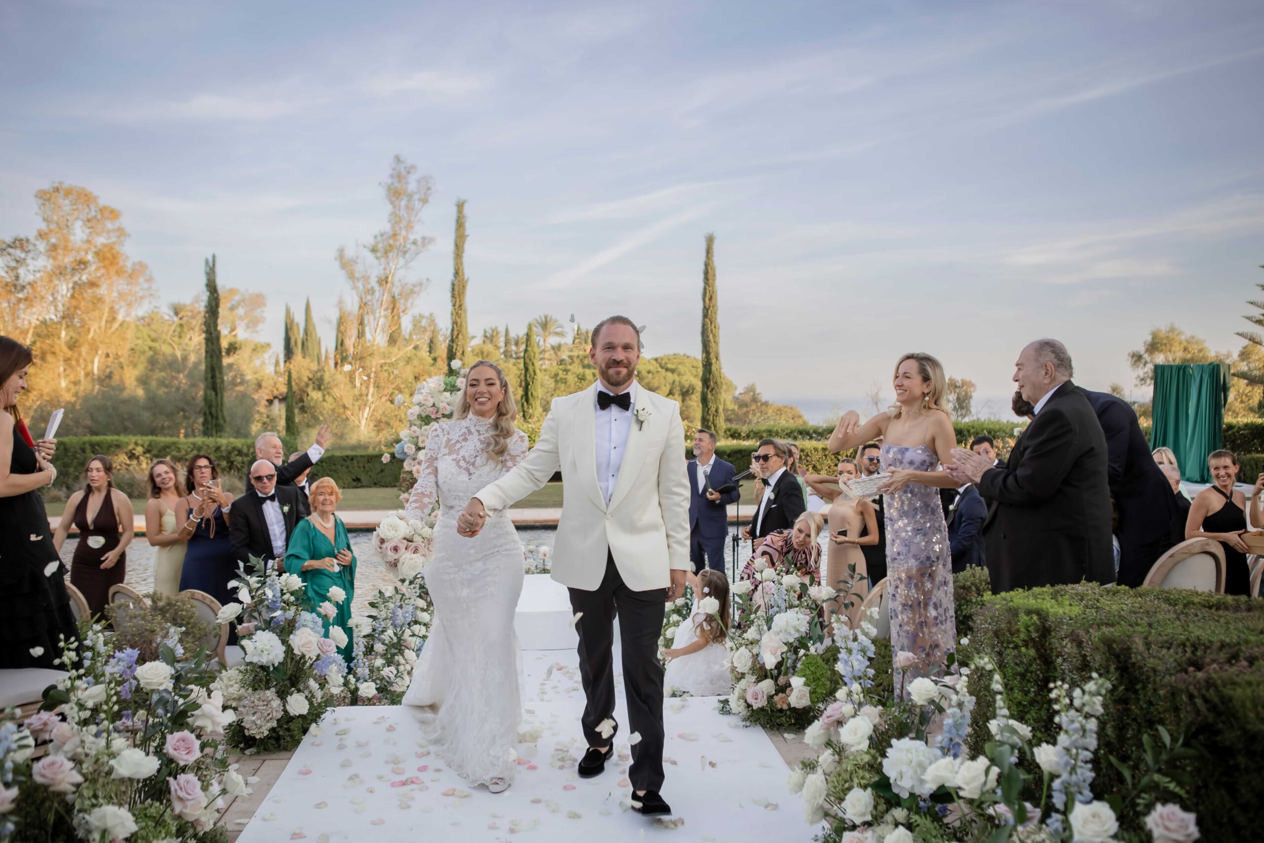As camy her turn to walk down the aisle approached, nerves began to creep in. But the sight that greeted her took my breath away. Two white pillar at the beginning of the aisle with big floral arrangements, and the aisle with carefully curated flower arrangements in beautiful colours. Every detail arranged perfectly by her team. At the end of the aisle, Camy saw her husband standing on a round platform beneath a stunning half-moon arch made of hydrangeas, roses, and delphinium. It all came together so flawlessly, a vision more beautiful than we could have imagined the glowing heart of a Villa Wedding in Marbella.