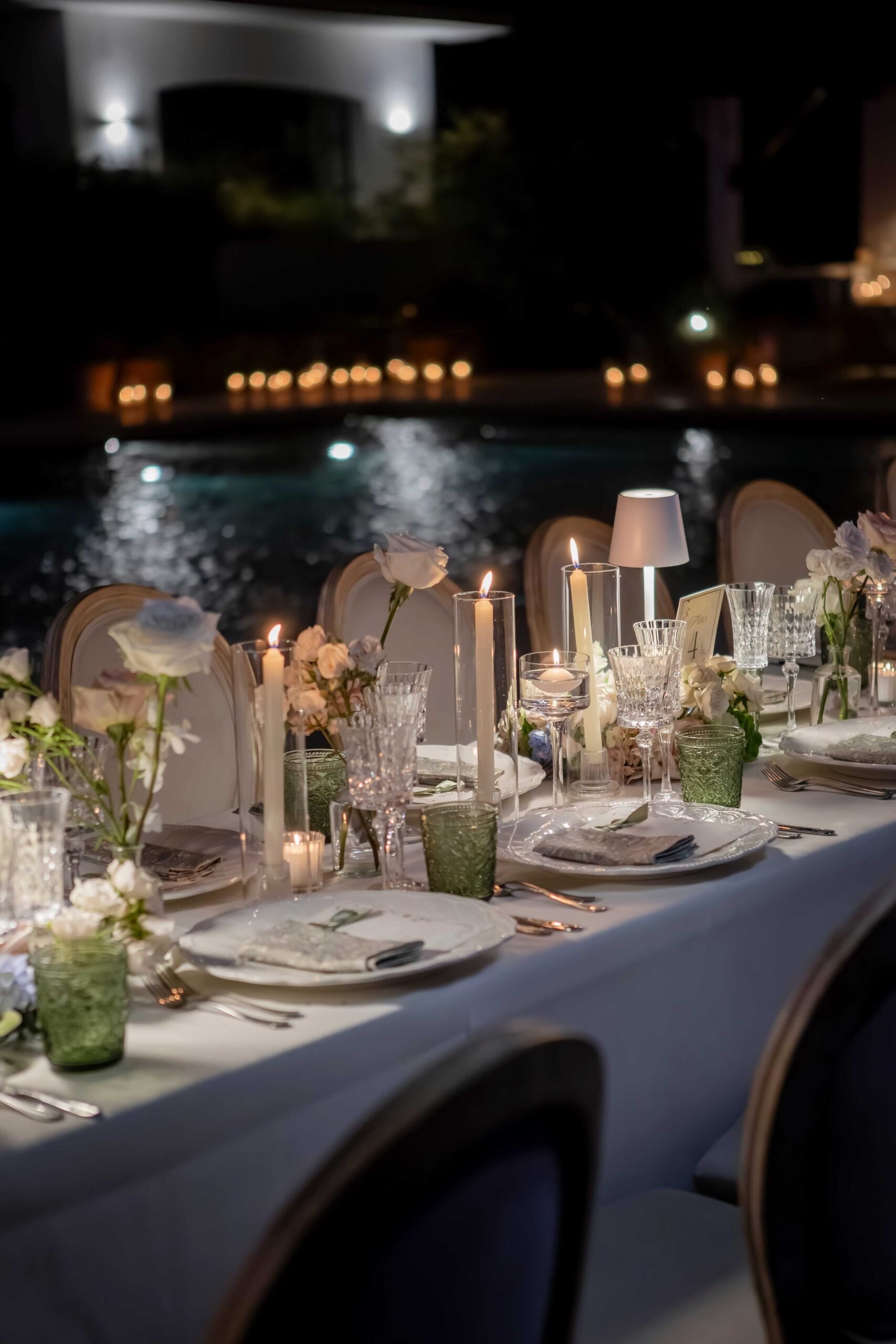 The table numbers perfectly matched the bow-tied menus, and round centerpieces with delicate lamps added a warm, elegant glow. Candles were placed all around the pool and party area, enhancing the magical ambiance. The band had its own stage, draped in beautiful green fabric that complemented the setting perfectly. As the sun began to set, everything the flowers, the lights, the décor came together to create a breathtaking scene straight out of a fairy tale.