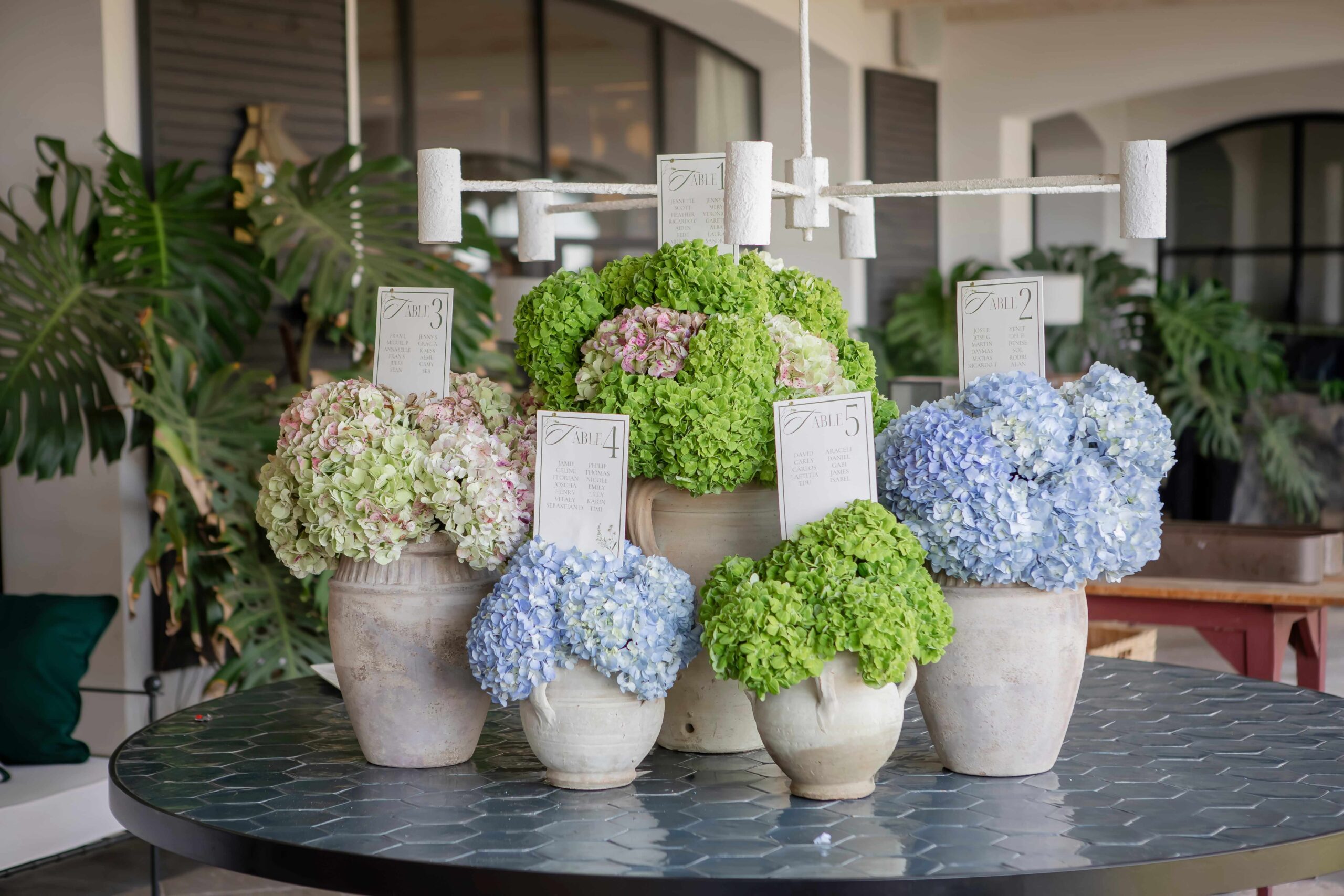 When it was time for dinner, we checked out the seating plan, adorned with hydrangeas in ceramic vases, it looked absolutely lovely. Dinner was set up behind the pool, with a long table draped in cascading garlands that seemed to float above it. Chandeliers hung gracefully overhead, adding to the beautifully put-together, fairy-tale atmosphere.