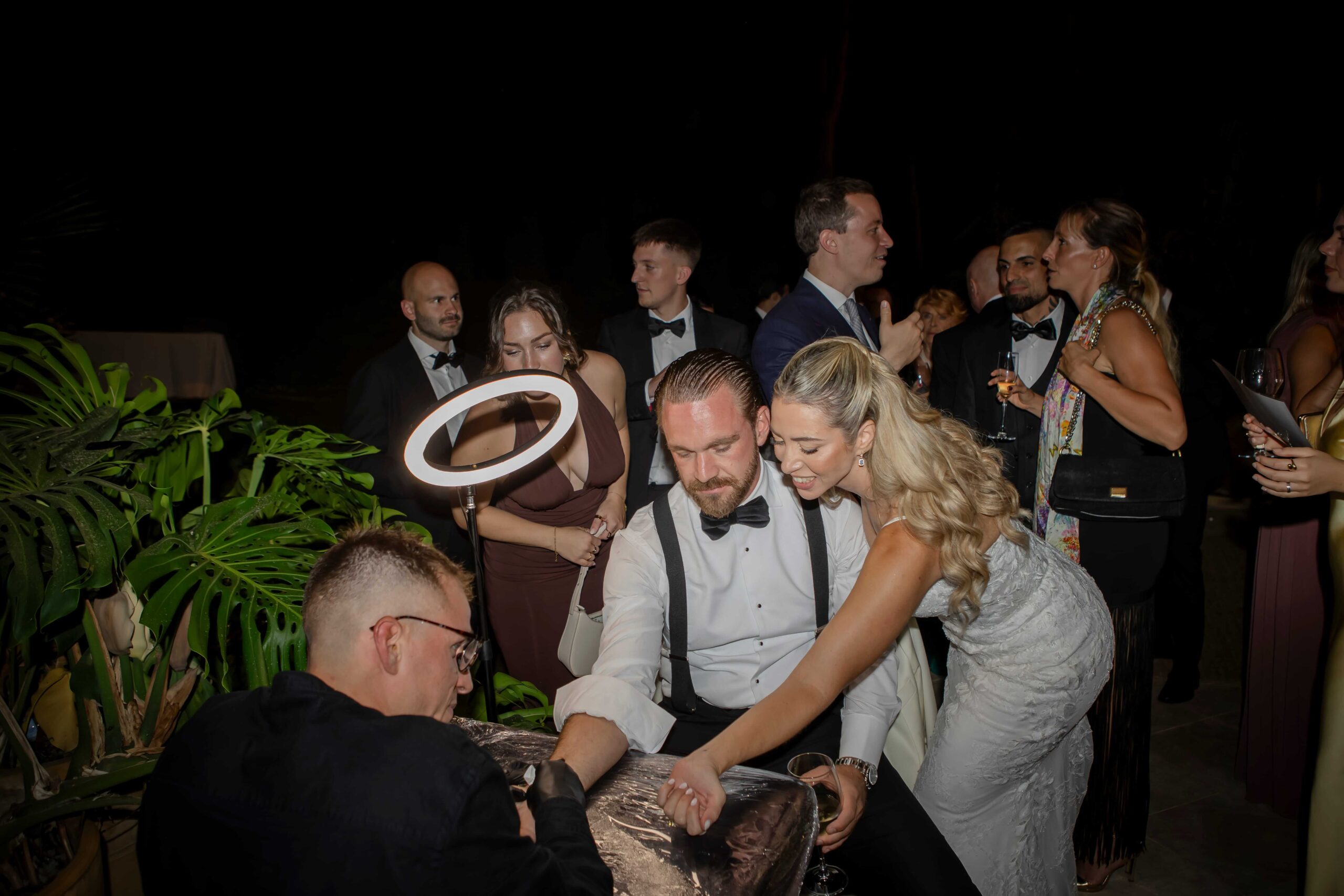 After the wedding, we headed to the cocktail party, and Camy was completely surprised to see a tattoo artist waiting for them, Her husband had planned it as a special surprise. Camy got her very first tattoo, matching his, and it felt like such a unique and personal way to mark their weddingday.